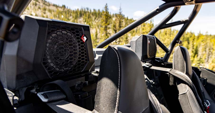 Factory Tuned & Integrated Rockford Fosgate Stage 4 Audio System with RIDE COMMAND Source Unit. Includes (2) 100 watt 1-inch tweeters, (2) 100 watt 6.5-inch component front speakers, (2) 100 watt 6.5-inch coaxial rear speakers, (1) 400 watt 4-channel amplifier, and (1) 10-inch subwoofer with an integrated 400 watt subwoofer amplifier. *Audio System is IPX7 and IPX9K water immersion tested to withstand the wet elements.